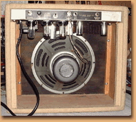 but there were a couple of functions that seemed to be tailor made for my needs. I went through the original schematic, verified the circuit paths, etc., and made a modern version (you can find it in our amplifiers section, under schematics). It took about 4 hours, but when I was finished, I was happy I took the time to do it right. (Side note: for those of you who care, my diagram differs from the original in only one place - the original shows the brown & blue wires coming from the output transormer going to pins 3 on the two 6V6 tubes - this is the correct configuration, but the original diagram has them wired out of phase. My diagram corrects this.)With my new diagram in hand (actually, I just carried my laptop out to the garage and put it on the workbench) I started wiring everything together. This went very quickly, since I wasn't struggling to read the old schematic.  It took about 3 hours to complete, only because I double & triple checked each connection - I really didn't want to blow anything up because I was careless. When I was finally sure that I did everything right, I wired up the new power cord (I replaced the original with a 3-prong cord), re-installed the chassis in the cabinet, and plugged it in. I'll admit I was nervous about what was going to happen - I was pretty sure it would work, but there was just a little bit of aprehension that I couldn't completely squelch. I was nervous enough that I stood WAY back from the amp, and I used a really long screwdriver to flip the switch on the power strip. Yes, I felt like a doofus, but I comforted myself with the knowledge that there was no possible way I was going to get shocked.