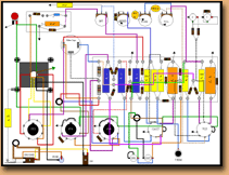 components together. It took me 5 minutes to come to the conclusion that the original schematic just wasn't going to work. I had an 8 1/2"x11", poor quality reproduction of the original black & white line drawing - not the sort of thing that people with (already) poor eyesight need to be staring at for hours. It seemed to me that the best guide (for me, anyway) would be a multi-color graphic representation of the physical layout of the amp, that I could (preferably) zoom in on if I so desired.