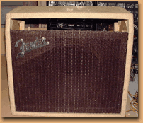 Electronically the amp was finished. Cosmetically, it was a candidate for reconstructive surgery. The tolex was a horrible blonde, dirty & ripped, so that had to go. I hopped online and ordered some new brown tolex - after I got it I noticed it was the pinkish brown - not my first choice, but it would have to do. I stopped off at Home Depot and bought 2 cans of 3M spray adhesive, and went home & got to work. The only really hard part was getting the old stuff off. That took a couple hours, but once it was all off, the measuring, cutting, and application of the new tolex only took about 1.5 hours. I also replaced the handle, the feet, and the grill cloth. All in all, it's a fine amp - classic Fender sound, plenty of bottom end, it's the perfect gigging amp. Total time for the restoration was 2 weeks..... and behold! The completed amp cometh! ![]() ![]() ![]() ![]()  |