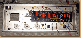 I started off with the lamp assembly - it's in a wierd place, and it's a little difficult to get the nut tightened properly. Next I installed the tube sockets. I had originally bought "replacement Fender tube sockets", but it turns out that they didn't fit the holes in the vintage chassis. I returned them to Torres' shop and got some slightly smaller ceramic sockets instead (actually, I was happier this way - the ceramics used machine screws & nuts, so I could attach tube clips to them). Next came all the assorted front and rear mounted components - switches, jacks, fuse assembly, & pots. Once those were installed I mounted the transformers, and finally the circuit board(s).